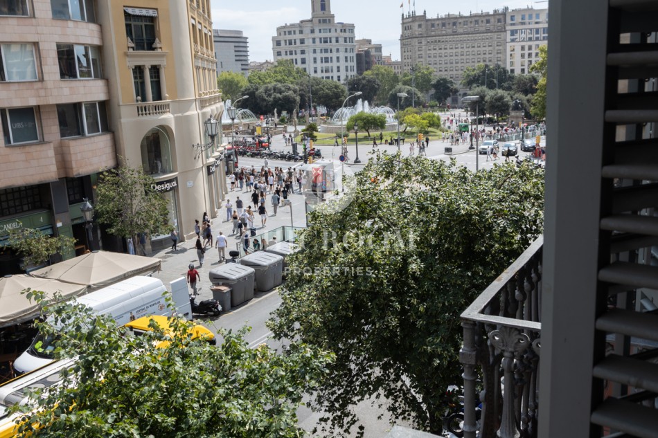 The apartment features a balcony overlooking the Rambla Catalunya from the living room. It has two bedrooms, including a suite and a second bedroom.