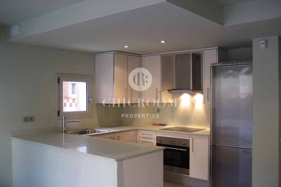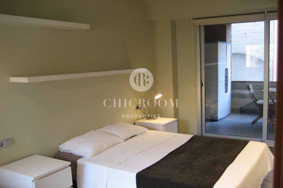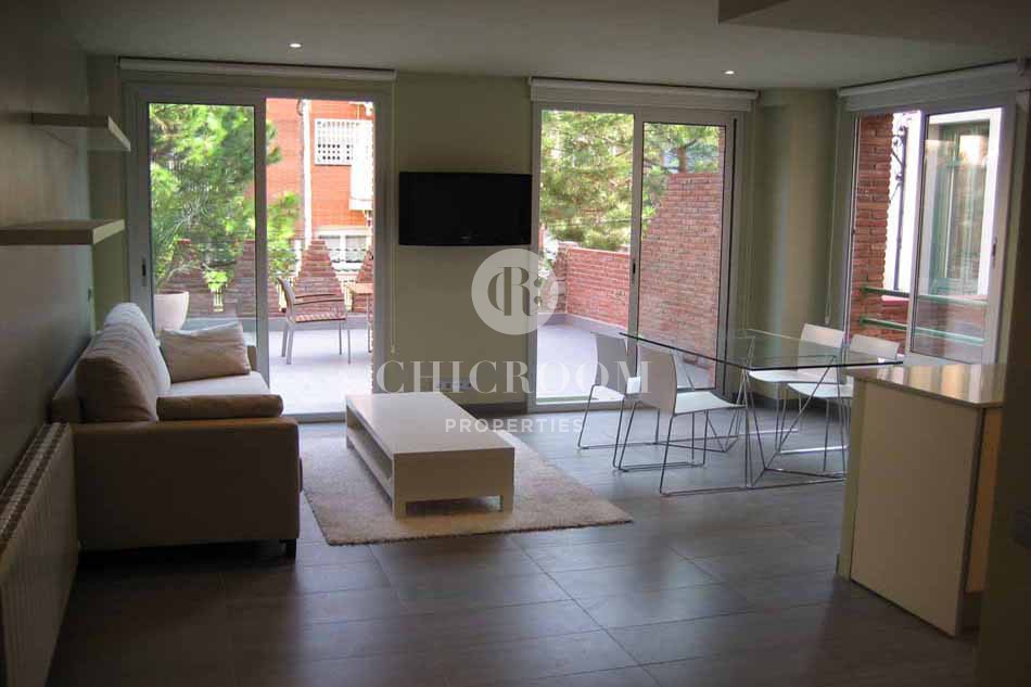 This property would be great for those looking for long-term accommodation in a quiet neighbourhood with great links to the rest of the city. Spread over 105m2, this spacious property has an open plan living space, which incorporates the kitchen, living room and dining room. The kitchen is fully equipped with all the appliances you may need and there is also a small laundry room. In the living-dining space, the sleek, glass dining table is set up to accommodate four people, but could comfortably seat six, making it ideal for entertaining guests. There is a sofa and television, perfect for relaxing on after a long day. The room is beautifully light, thanks to the large glass doors and windows that open up onto your very own private terrace, a real jewel and great for al fresco dining or topping up your tan during Barcelona's hot summer months.