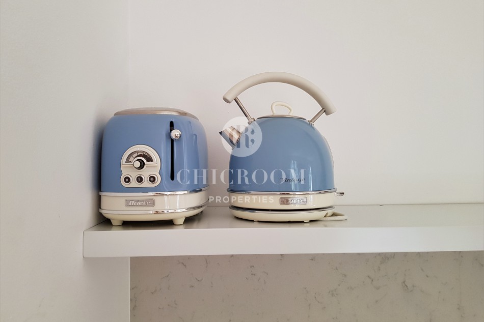 On the other side, there is the kitchen and the dining room. They contain high-end household appliances such as a SMEG fridge and Ariete items with a vintage style.