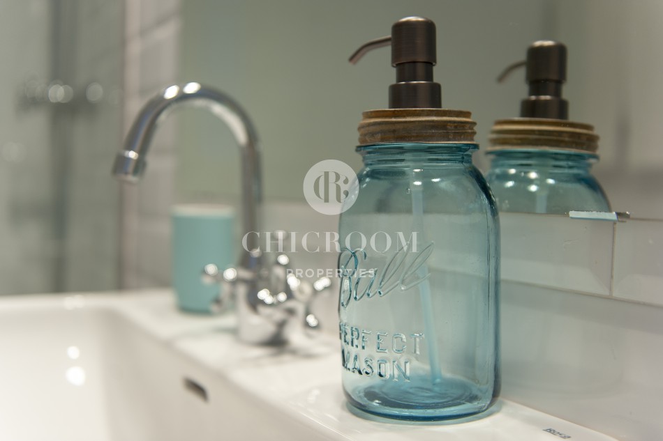 The incredible style of the property also echoes into the bathroom. White tiles have been places of the walls to create an illusion of exposed bricks. The shower is an ample cabin that is semi-closed by a glass door.