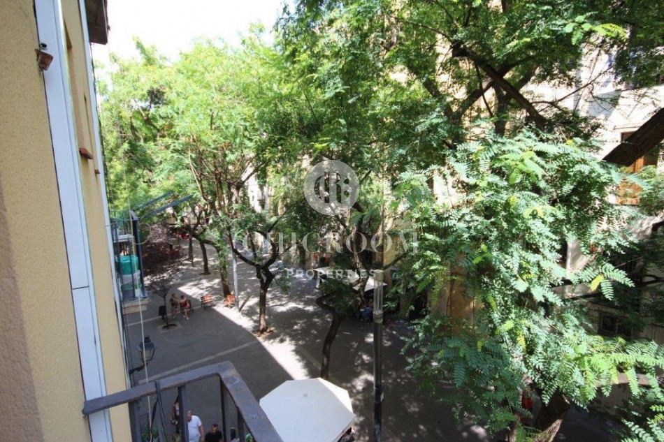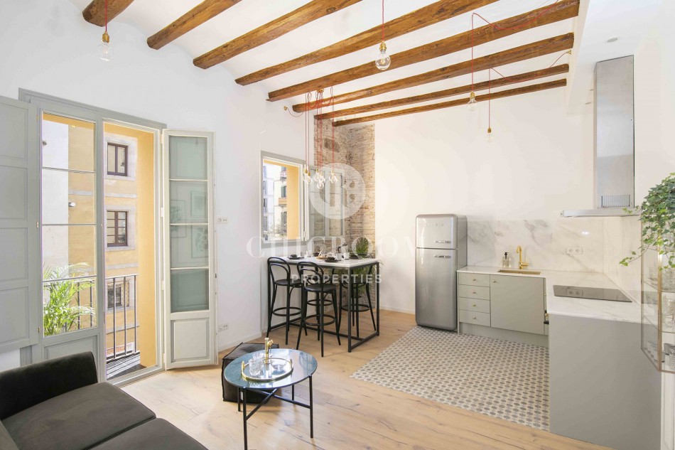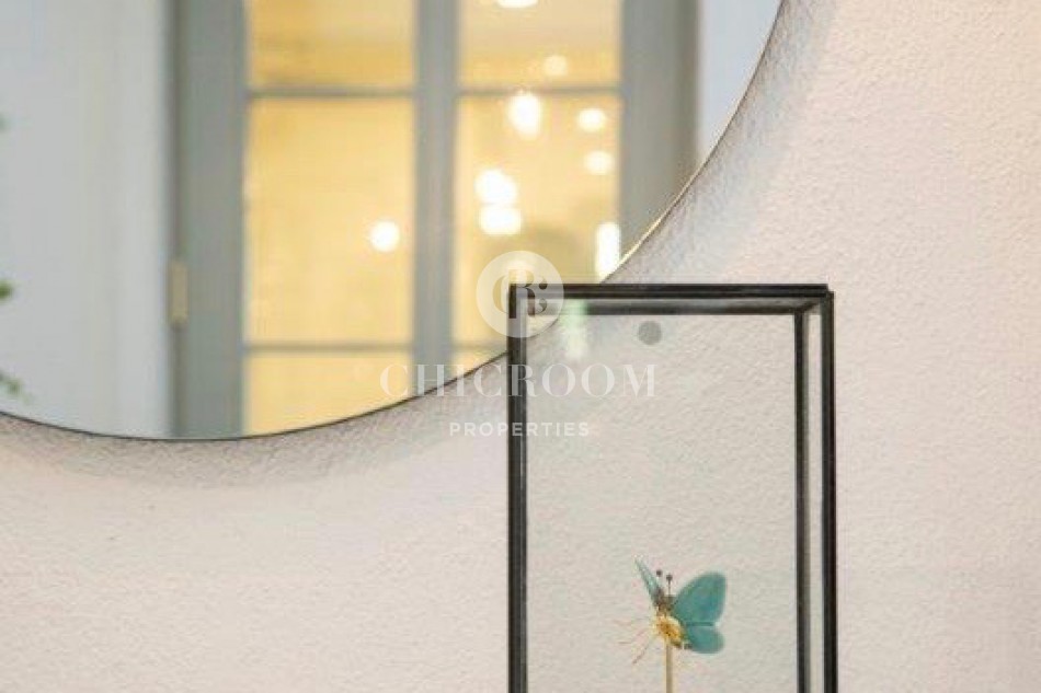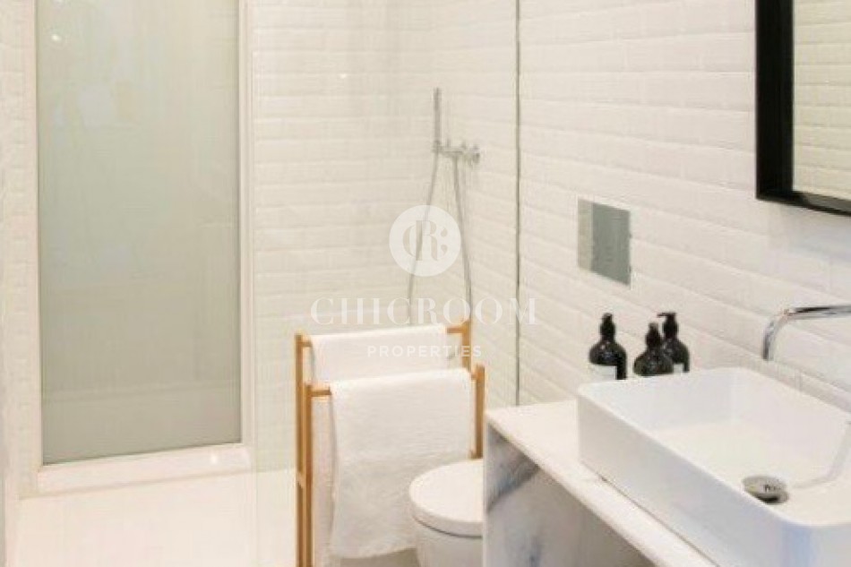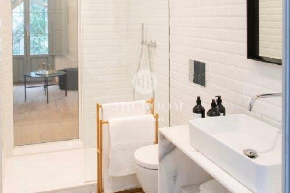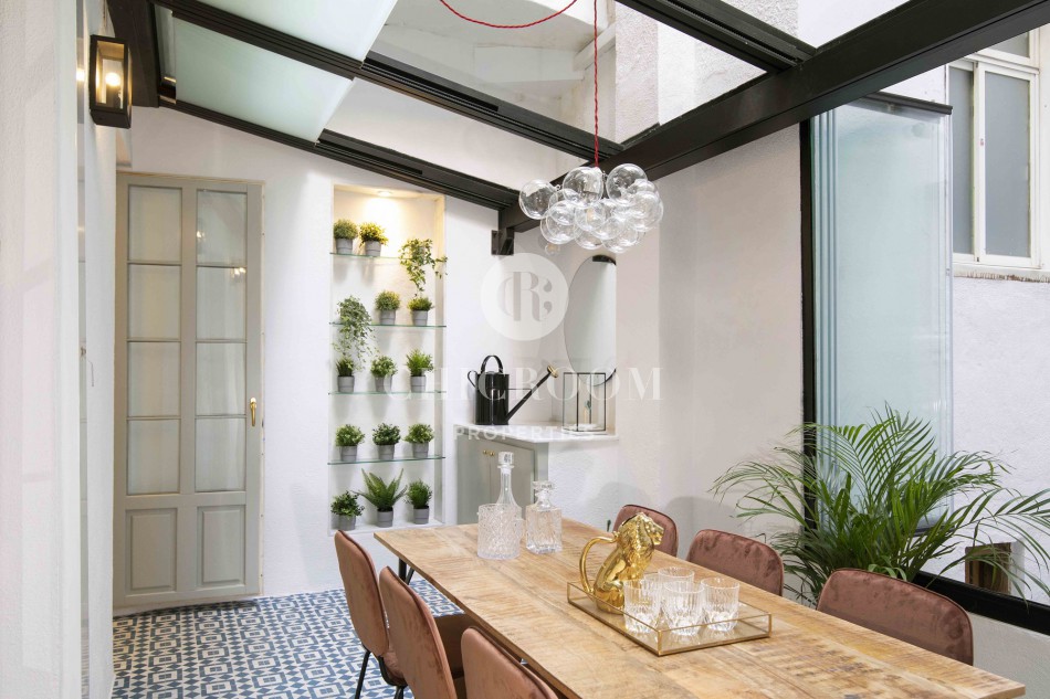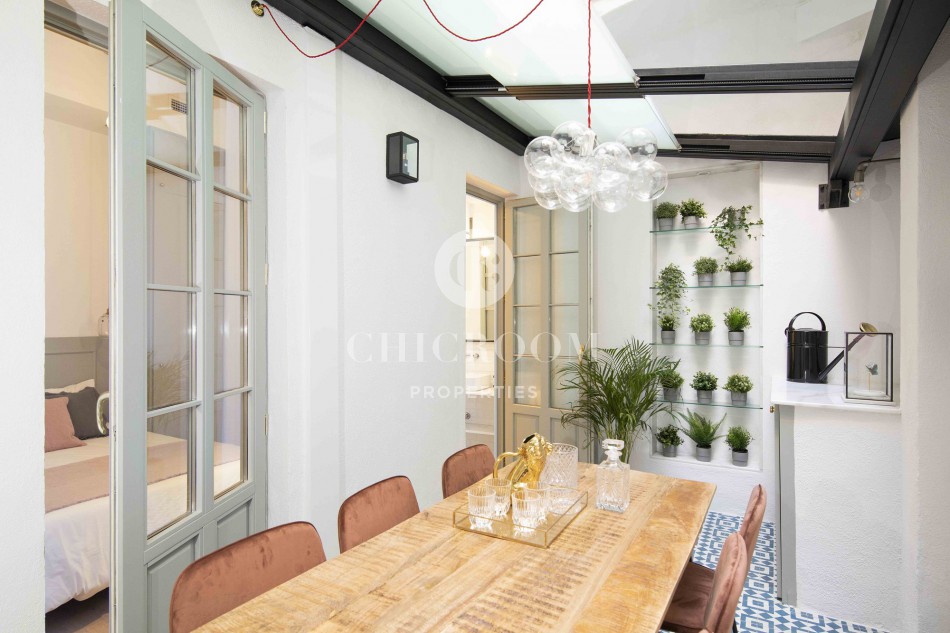 El interior de la propiedad está decorado de una manera elegante con muebles minimalistamente chic y cómodos que inmediatamente te harán sentir como en casa. Las baldosas hidráulicas catalanas y el hermoso parquet de madera de Kährs se alinean en los pisos y las paredes blancas frescas proporcionan un lienzo fresco para los elegantes muebles. La zona de estar principal es muy abierta y consta de una sala de estar y una cocina con comedor. Las vigas de madera, los ladrillos expuestos y la iluminación de diseño crean un tono industrial que contrasta maravillosamente con los impresionantes acabados de la cocina, que incluyen paredes de mármol y elegantes electrodomésticos de alta gama. La cocina está totalmente equipada con nevera, estufa de inducción, horno, lavavajillas, lavadora y secadora. La habitación es muy luminosa con una gran ventana y un balcón que da a la calle arbolada de abajo.