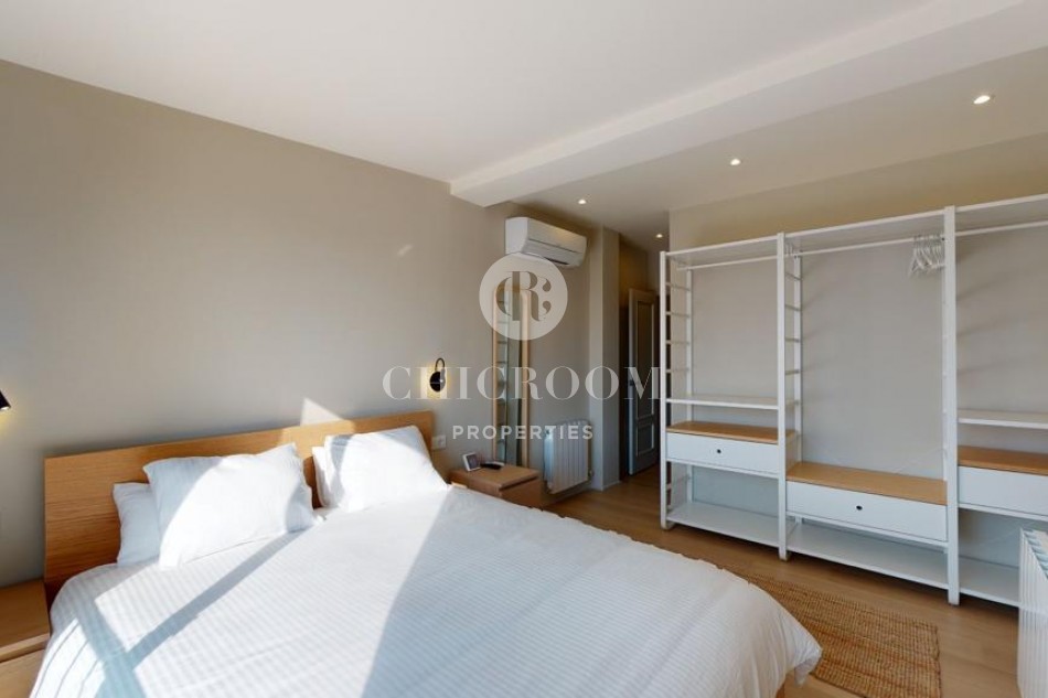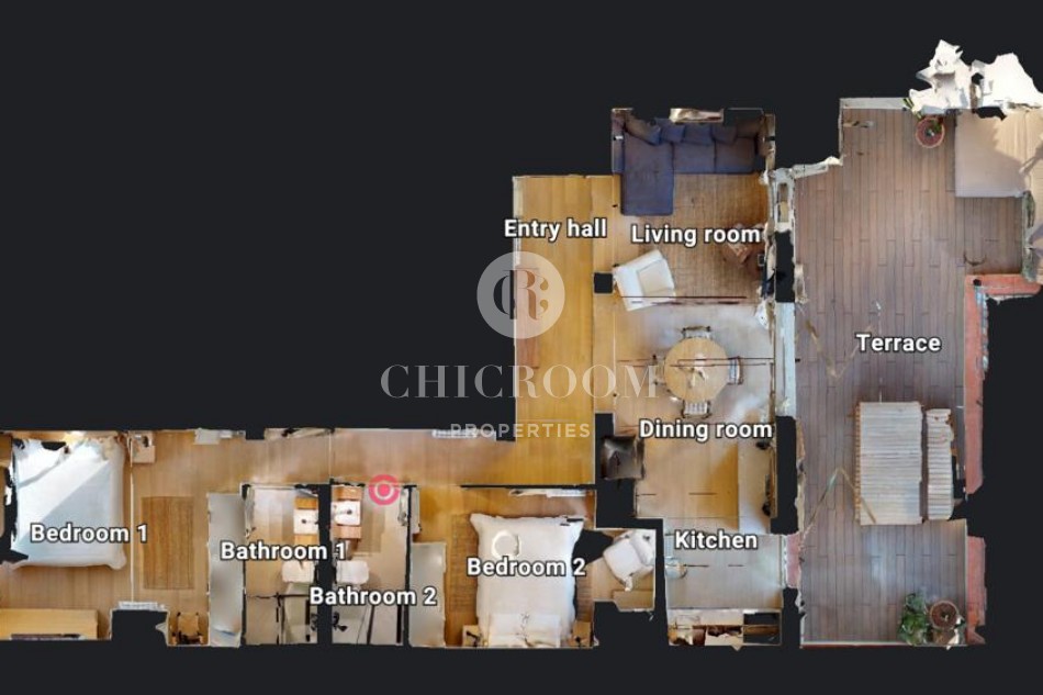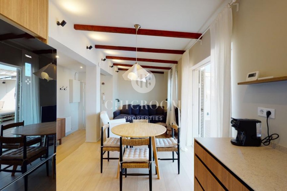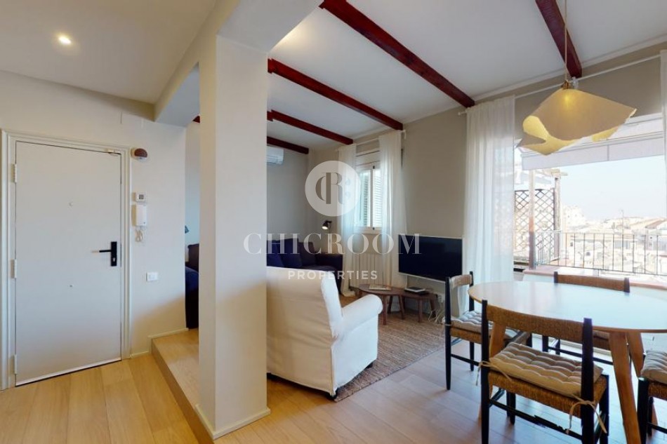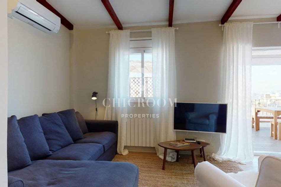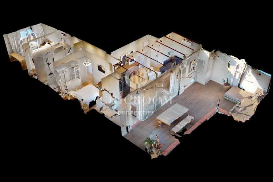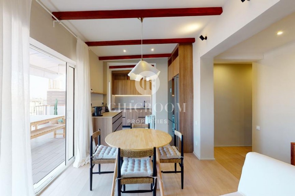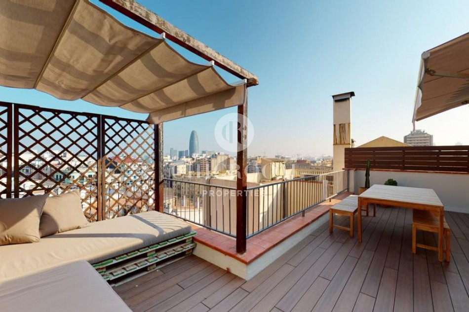 En entrant, nous trouvons un grand salon avec une kitchenette parfaite pour partager les petits déjeuners et les dîners avec les amis et la famille. Le salon dispose d'une table à manger pour quatre personnes, d'un confortable canapé trois places, d'un fauteuil supplémentaire et de deux tables basses. Un espace très confortable à apprécier! Les parquets donnent beaucoup de qualité à la maison et les murs peints en blanc lui confèrent calme et harmonie. Il est très lumineux grâce aux grandes portes qui s'ouvrent sur la grande terrasse chill-out de 30 m² avec vue sur Torre Agbar et Poblenou. C'est une terrasse privée en bois de teck entièrement équipée pour profiter du beau temps à Barcelone et qui donne une plus grande amplitude à cette magnifique maison. C'est une caractéristique de luxe pour une propriété à Barcelone et une formidable opportunité de profiter au maximum du climat chaud et ensoleillé de la ville. Elle dispose d'un espace détente avec un lit double et une grande table pour plus de 6 personnes.