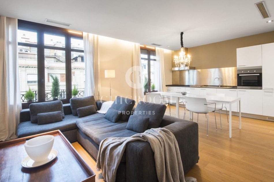 L'appartement entier a une superficie de 70 m2. Dans la pièce principale, vous trouverez le salon décloisonné dans la salle à manger. Le décor est simple mais plutôt moderne; Vous vous sentirez immédiatement à la maison. Trois jolies et grandes fenêtres permettent à la lumière naturelle d'éclairer la pièce. Ils vous offrent également une belle vue sur la capitale catalane. Juste à côté de la pièce principale, vous trouverez la cuisine entièrement équipée avec réfrigérateur, plaque de cuisson, lave-vaisselle, lave-linge et four à micro-ondes. La chambre a un lit double. Vous avez des possibilités de stockage. La salle de bain a tout ce dont vous avez besoin; Douche, baignoire, toilette et lavabo. Tout l'appartement est décoré avec beaucoup de modernité et le parquet lui donne une atmosphère très chaleureuse. Il y a l'air conditionné ainsi que le chauffage dans chaque pièce de l'appartement. Vous pouvez éventuellement demander une place de parking.