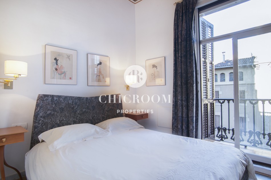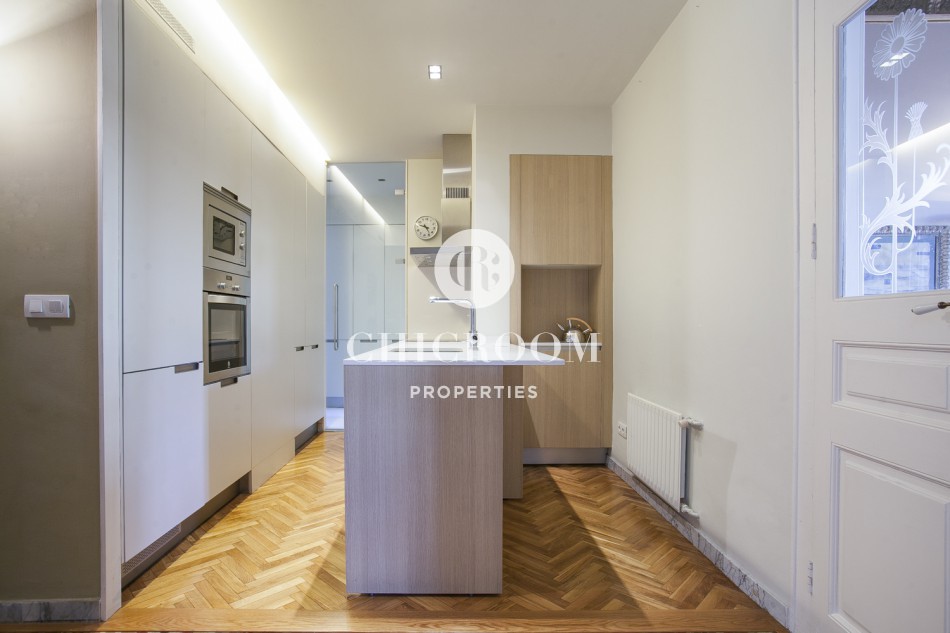 Croyez-vous au coup de foudre? Si non, préparez-vous à l'expérimenter pour la première fois avec cette propriété. Vous serez immédiatement étonné par sa beauté dès votre entrée. Des planchers avec le beau parquet ou les tuiles catalanes hydrauliques traditionnelles aux plafonds avec les moules en bois peints originaux, chaque détail a été méticuleusement pensé pour maintenir l'aspect original de l'appartement et le mélanger avec une touche de modernité. Vous trouverez d'abord la cuisine entièrement équipée avec des appareils ménagers flambant neufs avec plusieurs armoires de rangement intégrées. De l'autre côté, il y a la grande salle à manger et un petit coin bureau. Lorsque vous suivez le petit couloir, vous arriverez au salon spacieux et lumineux meublé avec des meubles design de Philippe Starck. Il a une grande fenêtre qui donne accès à un balcon avec vue sur le quartier. De chaque côté de celui-ci, il y a deux grandes chambres doubles, également avec accès à un petit balcon. L'un d'eux a deux lits simples et l'autre a un lit double et une salle de bain complète en-suite. Il y a deux autres salles de bain complètes avec douche, WC et lavabo.