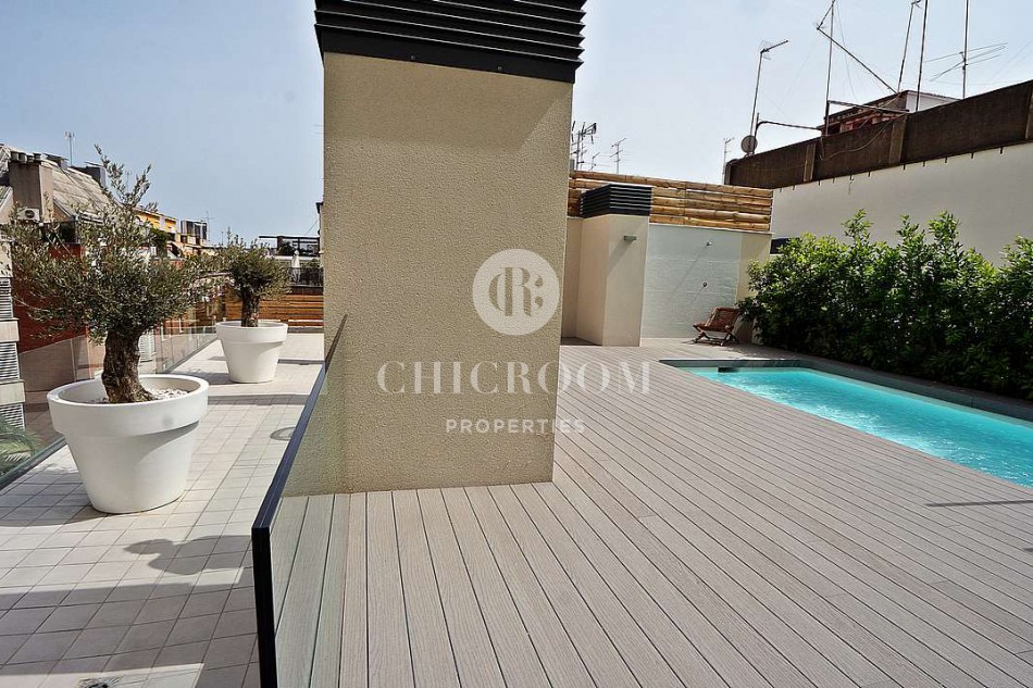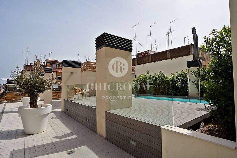 Le strutture dell'edificio aggiungono attrattiva con il tetto comune ornato da ulivi e la piscina circondata da un ponte di legno. Due posti auto sono inclusi con il noleggio, il che è un grande vantaggio in questa zona di Barcellona. L'acqua è riscaldata grazie ai pannelli solari.